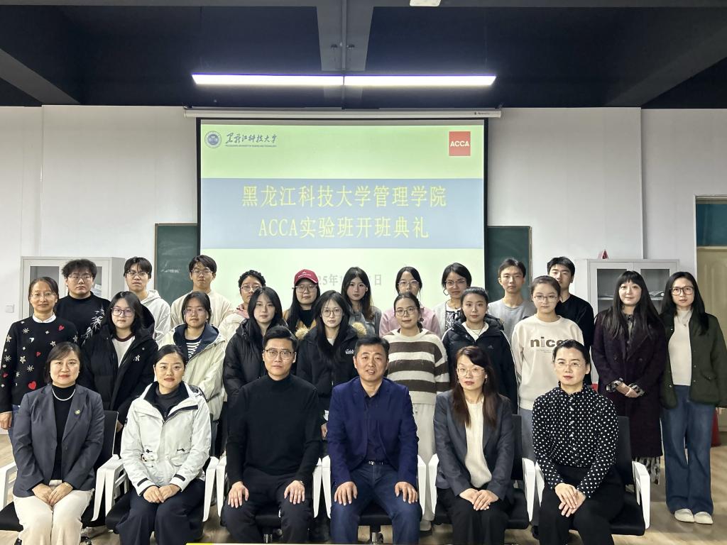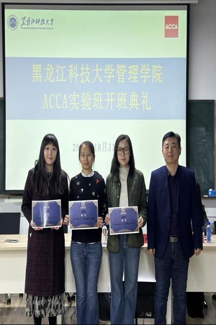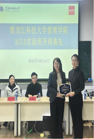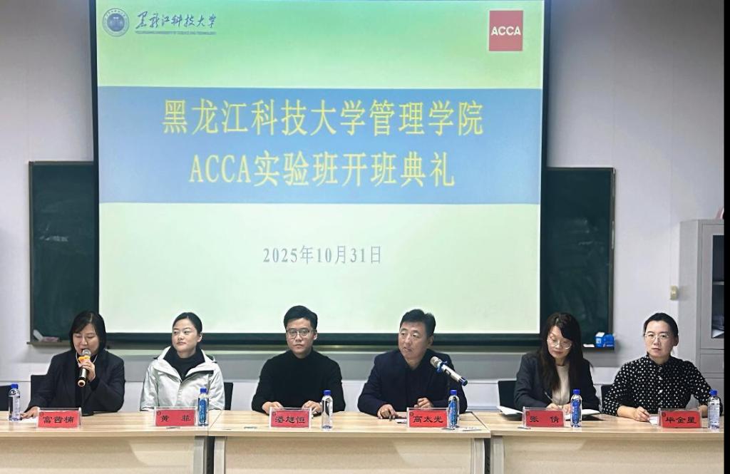 2025年10月31日,管理学院首届ACCA实验班开班典礼在管理学院跨专业综合实验室举行,参加开班典礼的领导及来宾有管理学院副院长高太光教授、管理学院副院长张倩教授、ACCA 沈阳代表处业务发展主任黄菲女士、好睿教育黑龙江省执行校长潘旭恒先生及管理学院国际教育中心主任、24级ACCA实验班班主任毕金星副教授。开班典礼由国际教育中心副主任富茜楠主持。