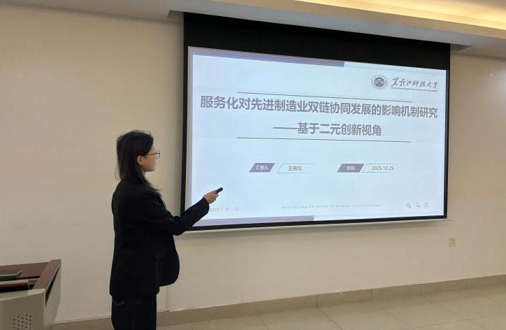 25 日下午,年会围绕 “新时代的科学学” 主题设置 50 个平行分会场。其中,王晓慧同学在第 46 分会场进行会议汇报,报告题目为《服务化对先进制造业双链协同发展的影响机制研究-基于二元创新视角》,中国科学院科技战略咨询研究院副研究员、中科院创新发展研究中心产业部主任乔为国、山东理工大学管理学院薛凯超书记并对该报告进行点评。