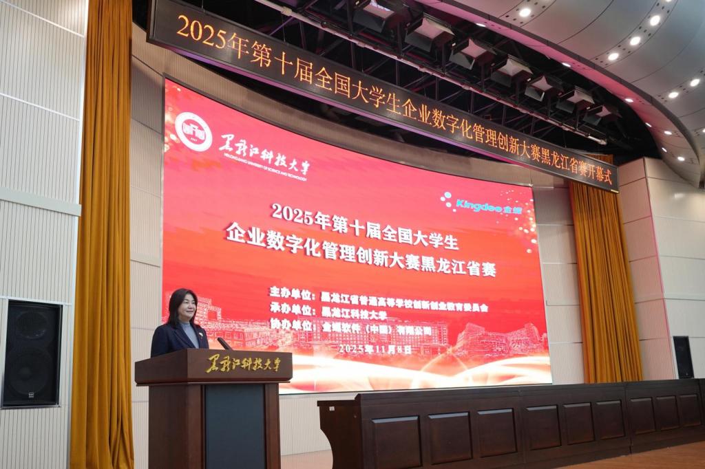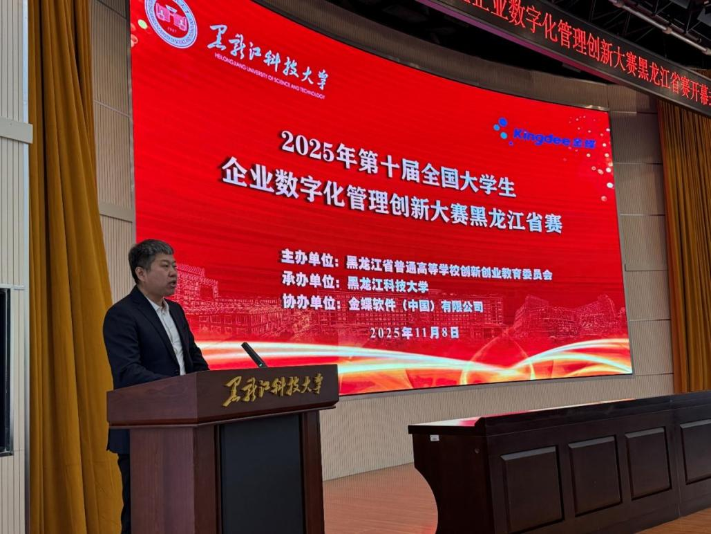 11月8日,由黑龙江省普通高等学校创新创业教育指导委员会主办,黑龙江科技大学承办,金蝶软件(中国)有限公司协办的2025年第十届全国大学生企业数字化管理创新大赛黑龙江省赛在我校顺利举行。学校党委常委、副校长谭旭红、金蝶软件(中国)有限公司黑龙江省公司副总经理孙振懿出席开幕式并致辞,我校双创学院院长谭平、管理学院院长洪亮和来自东北农业大学、东北石油大学、哈尔滨理工大学等省内18所院校的200余名参赛师生参加了开幕式。开幕式由管理学院副院长高太光主持。
