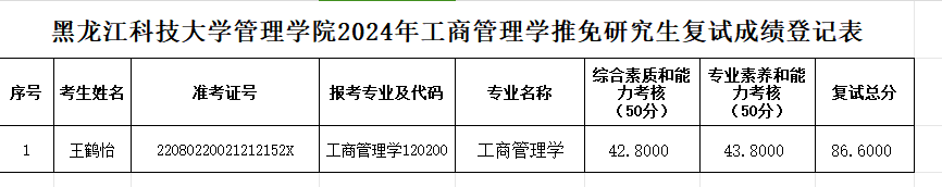 黑龙江科技大学管理学院2024年工商管理学推免研究生复试成绩公示