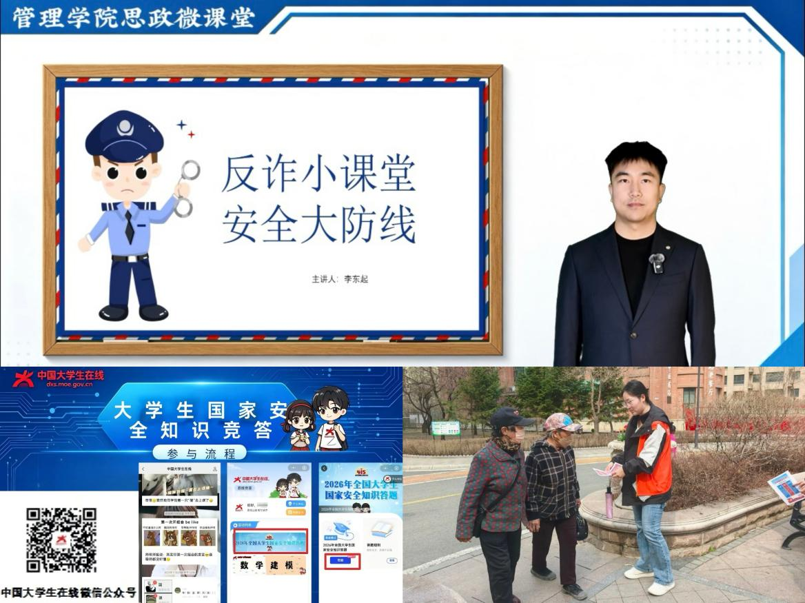 强化实践育人,延伸安全防线。学院坚持学用贯通、以赛促学、以学促行,校内校外协同发力,切实筑牢国家安全坚实屏障。依托管院之声微信公众号发布“反诈小课堂,安全大防线”主题思政微课堂,聚焦校园风险场景拆解诈骗手段、讲解防范技巧;开展“挺膺守国安,青春竞答赛”知识竞答、组织全体学生参与全国大学生国家安全知识答题等活动,以趣味化、竞赛化的形式普及总体国家安全观等核心要义,充分调动广大青年学生主动学习国家安全知识的积极性;组织星火志愿服务队走进松北区观江国际社区,开展“筑牢国家安全,共建平安社区”志愿服务,推动安全教育从校园走向社区,从理论融入生活,以实际行动凝聚家校社联动育人合力,助力共建共治共享的平安社区、和谐社会。